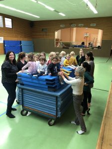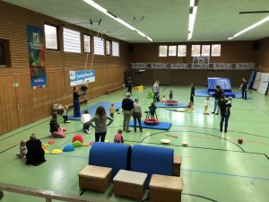 Seit etwa einem Jahr wächst das Eltern-Kind-Turnen des TV Vallendar, welches mittwochs in der Jahn Sporthalle stattfindet, stetig. Immer mehr kleine Turnerinnen und Turner entdecken schon ab einem Jahr Freude an Bewegung, Spannung beim Entdecken neuer Geräte und natürlich am Spaß mit Mama oder Papa! Spielerisch fördern wir die Motorik, die Körperspannung, das Körperbewusstsein und die Balance. Wichtige Punkte für die Entwicklung der Kinder in einer Welt, die immer weniger auf körperliche Aktivitäten ausgelegt ist. Sehr gefreut haben wir uns, als der Vorstand uns viele tolle neue Geräte präsentiert hat, die speziell für das Eltern-Kind Turnen angeschafft wurden: Zwei Trampoline für Kleinkinder, Balancebretter, Treppenelemente und vieles mehr. Bunt und perfekt für eine Stunde Bewegung – die immer abgeschlossen wird mit einer Runde Mattenwagenfahren. Wir Eltern geben dabei unser Bestes bei der musikalischen Begleitung mit dem Lied„Tuff-Tuff-Tuff die Eisenbahn“!