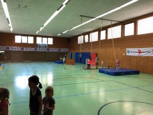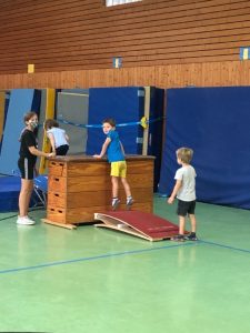 Dann kam Corona und zusammen mit den Schul- und Kindergartenschließungen mussten wir natürlich auch das Kinderturnen einstellen. 16 lange Wochen, bis es auch für den Turnverein möglich wurde, ein Hygienekonzept zu erstellen und den Sportbetrieb wieder aufzunehmen. Schon zu Beginn der Sommerferien konnten wir kleinere Gruppen wieder in die Halle lassen. Mit Hygienekonzept und – bei der Hilfestellung am Gerät– mit Maske. Es wird auch eine weitere Stunde für diese Altersgruppe angeboten, denn aktuell dürfen nur 15 Kinder gleichzeitig in der Halle turnen. Eine vorherige Anmeldung über eine App ist auch notwendig, aber alle Eltern machen mit– eine große Erleichterung. Es funktioniert, auch wenn man sich wahrscheinlich nie daran gewöhnen wird, dass auch 5jährige vorsichtig in die Halle kommen und fragen, wo denn das Desinfektionsmittel steht. Oder es mir tatsächlich einmal passiert ist, dass ich die Maske falsch herum anhatte und mich drei Kids sofort empört darauf aufmerksam gemacht haben (weiß innen, blau außen!)