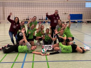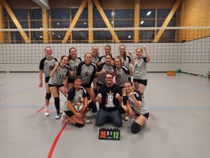 Zu Beginn des 1. Satzes merkte man den Vallerern noch etwas die Nervosität nach der langen Spielpause an, jedoch wurde ihr Spiel im Verlauf immer aggressiver und der Satz mit 25:11 gewonnen. Und obwohl die Aufstellung  im 2. Satz  auf vier Positionen geändert wurde, klappte das Zusammenspiel und die Überlegenheit insbesondere bei den Aufschlägen und im Angriff konnte beibehalten werden. Im 3. Satz fehlte bei den Damen die Konzentration und es kam zu vielen unnötigen Eigenfehlern, so dass dieser mit 20:25 verloren ging. Durch mehr Dynamik und Aggressivität im Angriff ging der 4. Satz wieder deutlich an den TVV, wobei der Matchball durch die beste Aufschlägerin des Teams Alicia Rivera-Eisenschneider mit einem Ass verwandelt wurde. Damit haben die Damen den ersten Sieg auf dem Weg zum erklärten Ziel, dem Aufstieg in die Verbandsliga, geholt.