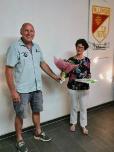Der 1. Vorsitzende, Hans-Peter Pretz, ließ bei der Geschenk-Übergabe ihre Zeit beim TVV Revue passieren: 1983 übernahm sie ihre erste Kinderturngruppe. Danach folgten das Training der „großen Mädchen“ und der Einstieg in den Erwachsenensport. Sie leitete Aerobic-Kurse und das allgemeine Turnen – aber auch Jazzgymnastik gehörte beispielsweise bei den Turnfesten oder Weihnachtsfeiern zu ihrem Repertoire. Immer wieder bildete sie sich in den verschiedenen Sportarten fort, so auch in der Wirbelsäulengymnastik und beim Walking. Bis heute sind ihre Kurse sehr gefragt und gut besucht – von ihrer Fitness können sich auch weit unter 75-jährige noch eine Scheibe abschneiden!