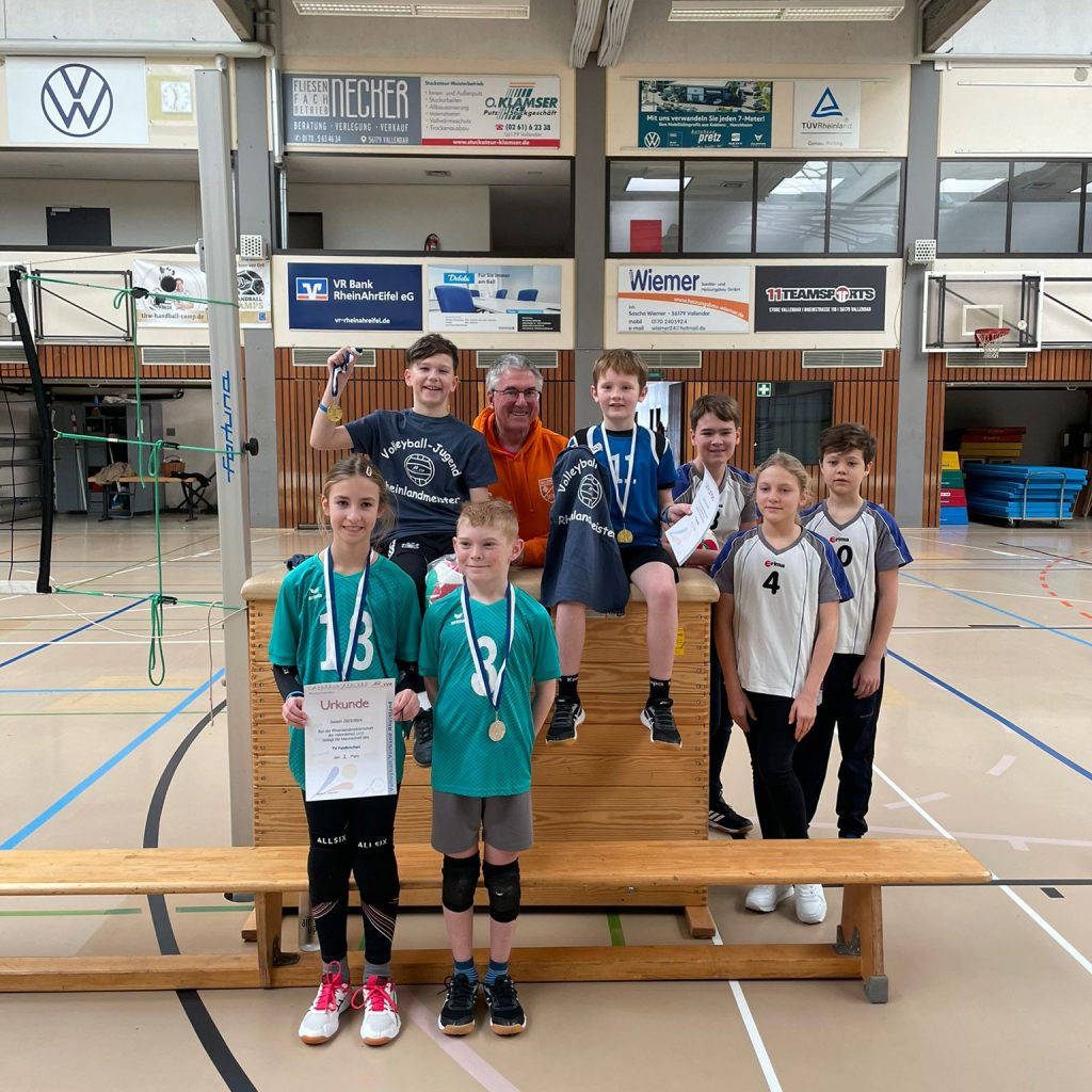 Die U12-Jungs des TV Vallendar hatten in den beiden Vorrunden gut geübt und die Spiele gegen Feldkirchen, dem einzigen weiteren gemeldeten Team, klar gewonnen. So machte sich Trainer Horst Schmidt wenig Sorgen um den Gewinn der Bezirksmeisterschaft des Volleyballverbands Rheinland am Sonntag, 21.01.23, in Vallendar. Allerdings sollten es diesmal, nach dem kurzfristigen Ausfall von Matteo Tumiliero, die beiden verbliebenen Spieler, Maxi Krück und Henri Kruppa, allein richten. Keine leichte Aufgabe. Feldkirchen spielte wesentlich sicherer als in den Vorrunden und konstanter mit 3 Ballkontakten auf der eigenen Seite. Henri und Maxi starteten nervös, hatten Schwierigkeiten in der Annahme und vergaben einige Aufschläge. Bis zur Mitte des ersten Satzes gestaltete sich das Spiel ausgeglichen und Feldkirchen lag zeitweise sogar in Führung. Dann wurden die Aufschläge des TVV sicherer, und Maxi wusste die Lücken auf der anderen Feldhälfte gut zu nutzen. 25:15 wurde der erste Satz dann doch klar gewonnen. Zu Beginn des zweiten Satzes verlor Vallendar einige Punkte durch die starken Feldkirchener Aufschläge. Aber die TVV-Jungs erspielten sich ihre Punkte durch überraschendes und gezieltes Zurückspielen mit dem ersten oder zweiten Ballkontakt. Jetzt trafen Henris Aufschläge von unten sicher die andere Feldhälfte und Maxi kontrollierte seinen Aufschlag von oben auch gut. Durch den leichteren Ball und das kleinere Feld ist der präzise Aufschlag nicht so einfach. Dadurch lag Vallendar zum Ende des Satzes weit vorne, bevor Feldkirchen wieder mit starken Aufschlägen punktete. Aber der TVV behielt die Ruhe und entschied den Satz 25:21 für sich. Stolz nahmen die Vallerer Jungs bei der Siegerehrung ihre Urkunde, die Goldmedaillen, die Rheinlandmeister-T-Shirts und einen neuen Spielball in Empfang. Ein besonderer Dank gilt Isabell Kux, Bennet Elberskirch, Max und Simone Schweda für ihre Unterstützung beim Schiedsgericht. So konnte die Rheinlandmeisterschaft U12m in Vallendar auch mit nur zwei Mannschaften durchgeführt werden. Beide Teams sind für die Landesmeisterschaft Rheinland-Pfalz qualifiziert und werden sich im April in Rheinhessen wiedersehen.